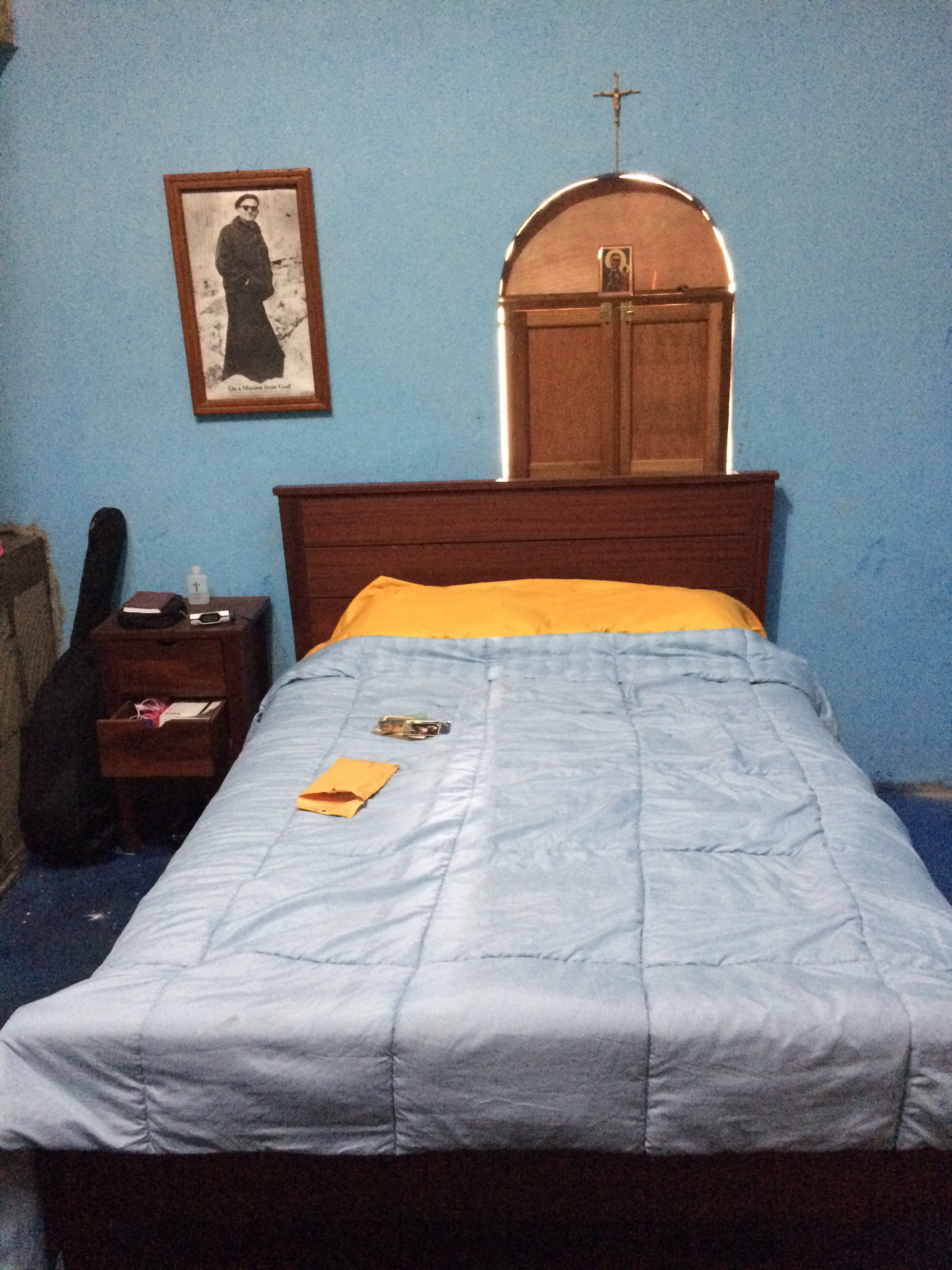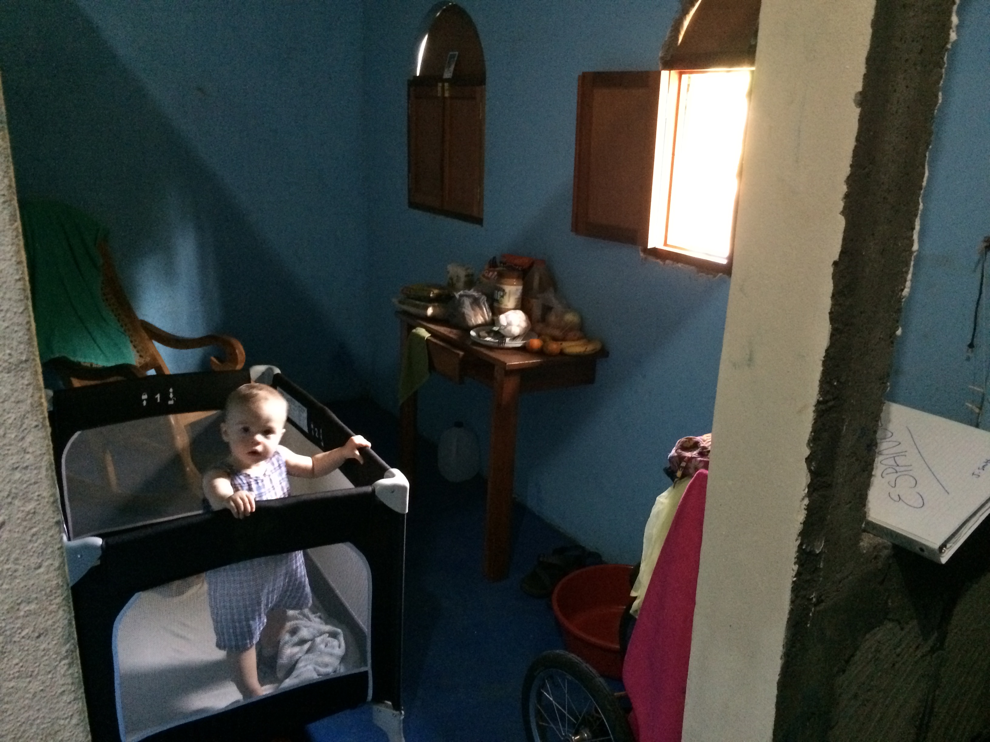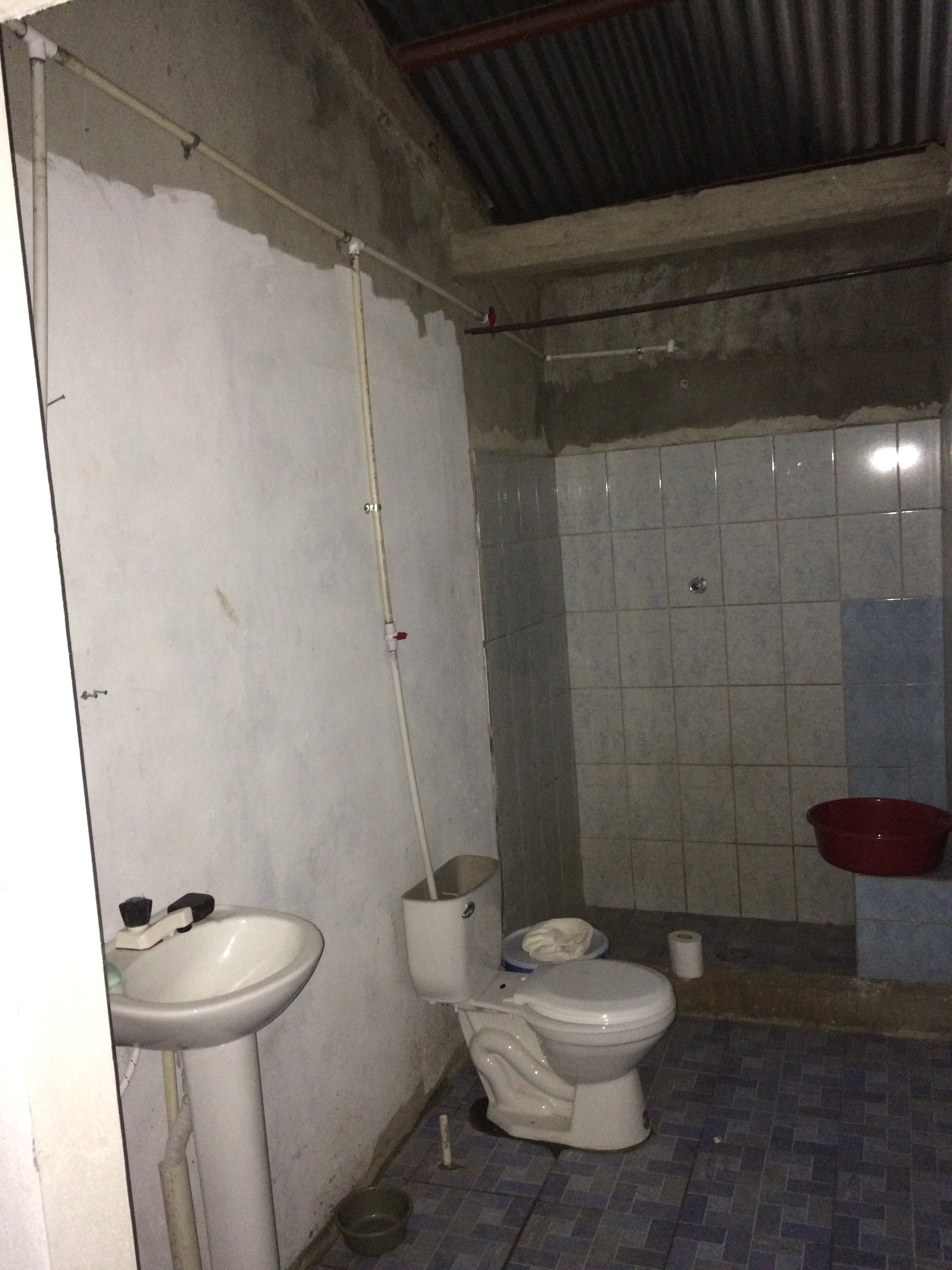 We have a main bedroom with a second lounge space and bathroom. This is a temporary living space for us in the big mission house. There was only an outhouse and shower drain installed to begin for the first two days. One of the hired local workers named Antonio took a full day to install the toilet, sink, and shower faucet. The water is stored in large containers and flow down by gravity to our bathroom. About every day Paul has to travel 2 km into town to the “tanque” to fill the containers of water.